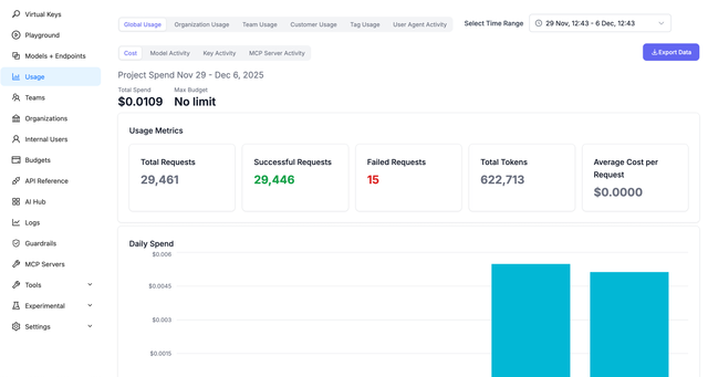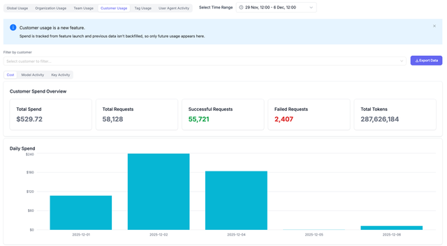 • Activity metrics: Track requests, tokens, and success rates per customer